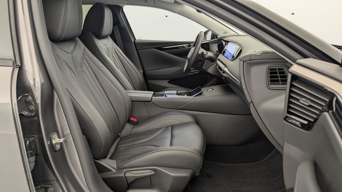 intérieur cuir grainé noir basalte et toile ds : ciel de pavillon clair décors de panneaux de porte chrome guilloché volant en cuir fleur mistral console centrale en toile ds mistral planche de bord en toile ds noir basalte façon écaille panneaux de portes en toile ds noir basalte façon écaille sellerie en cuir grainé noir basalte et toile ds