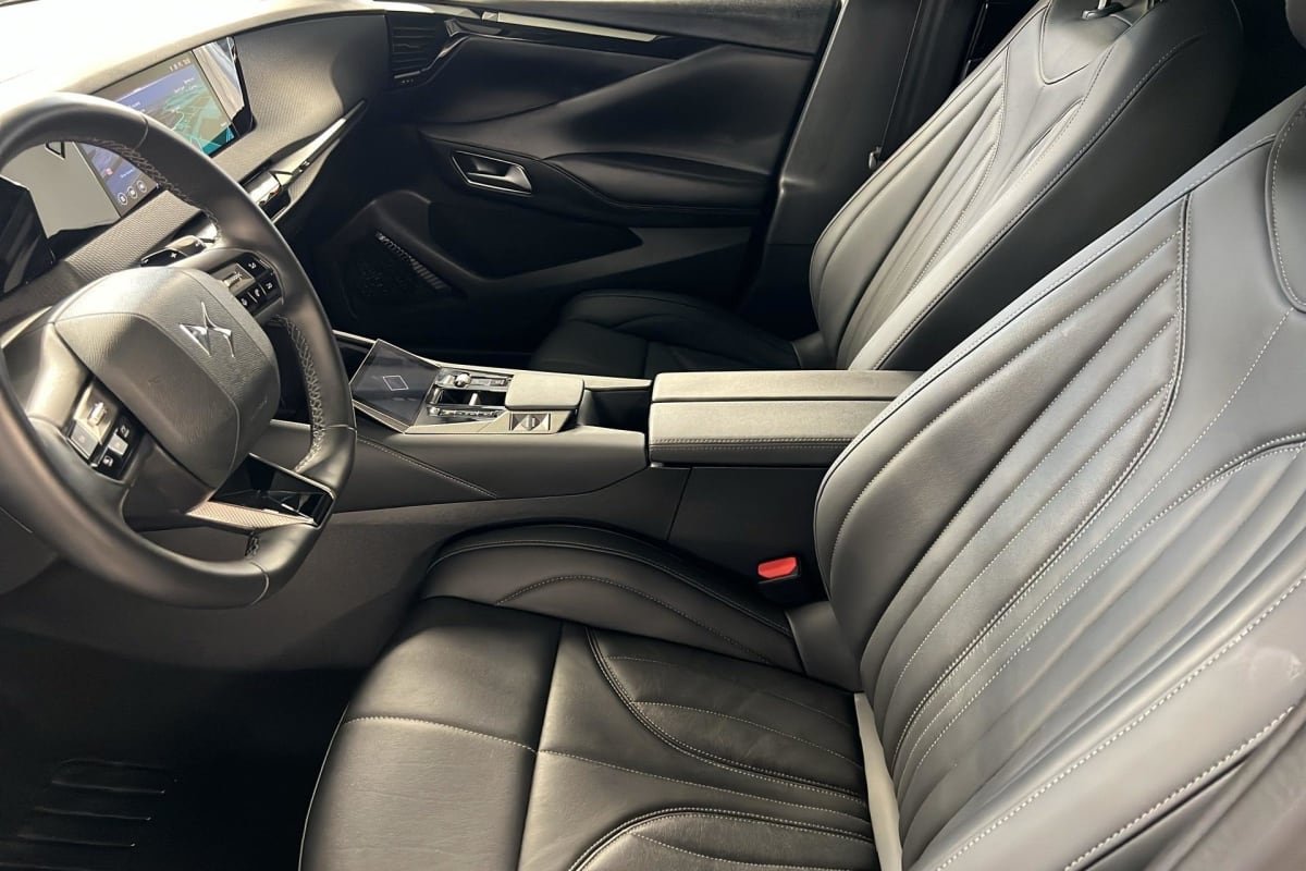 intérieur cuir grainé noir basalte et toile ds : ciel de pavillon clair décors de panneaux de porte chrome guilloché volant en cuir fleur mistral console centrale en toile ds mistral planche de bord en toile ds noir basalte façon écaille panneaux de portes en toile ds noir basalte façon écaille sellerie en cuir grainé noir basalte et toile ds parties centrales des sièges av, partie centrale des sièges latéraux ar et partie av des appuie-tête en cuir. bourrelets latéraux des sièges av, accoudoir central et siège central ar, et parties latérales et ar des appuis tête en toile ds.