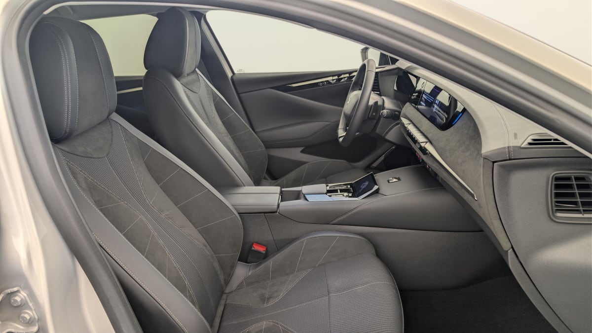 intérieur alcantara noir : planche de bord en alcantara ciel de pavillon clair sellerie en tissu tressé basalte avec alcantara et toile ds décors de panneaux de porte chrome guilloché volant cuir fleur mistral console en toile ds noir basalte panneaux de porte en alcantara et toile ds noir basalte