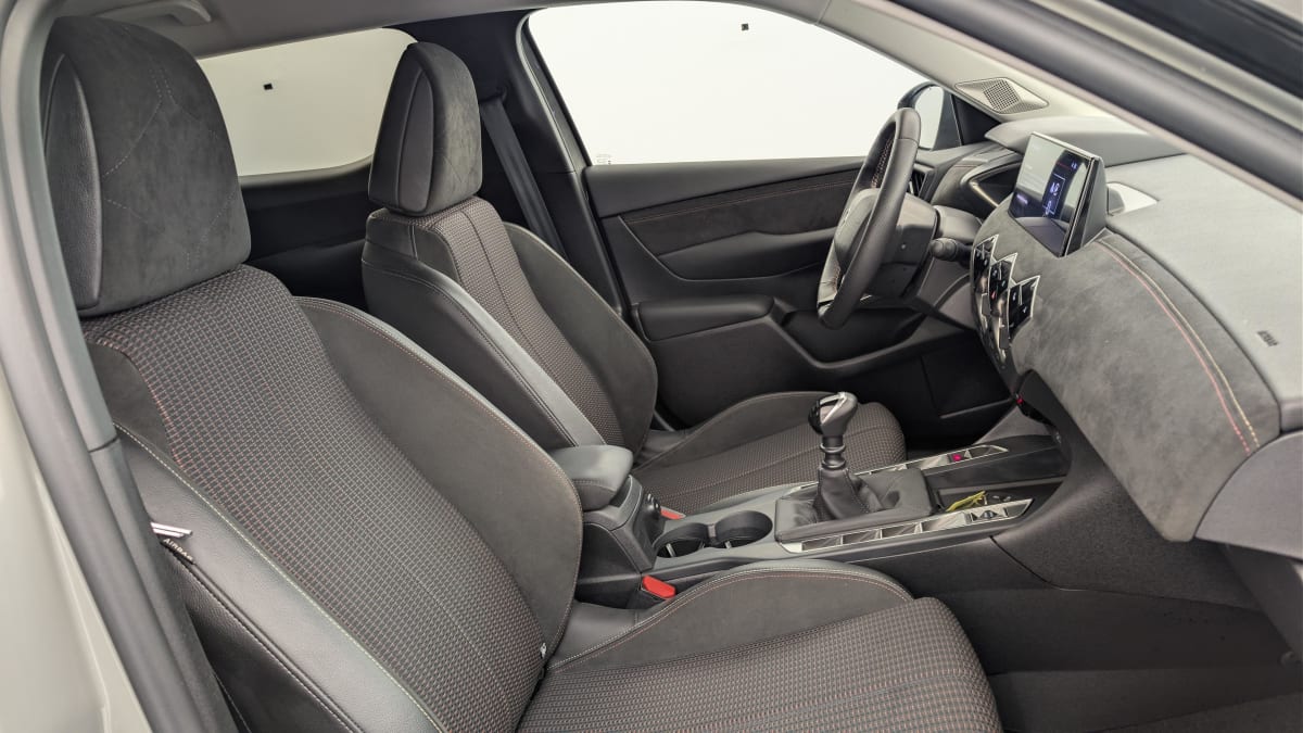 intérieur tissu tressé basalte avec alcantara : planche de bord alcantara noir ciel de pavillon gris galet volant cuir fleur perforé et coutures or et carmin décor alcantara noir siège tissu tressé basalte avec alcantara
