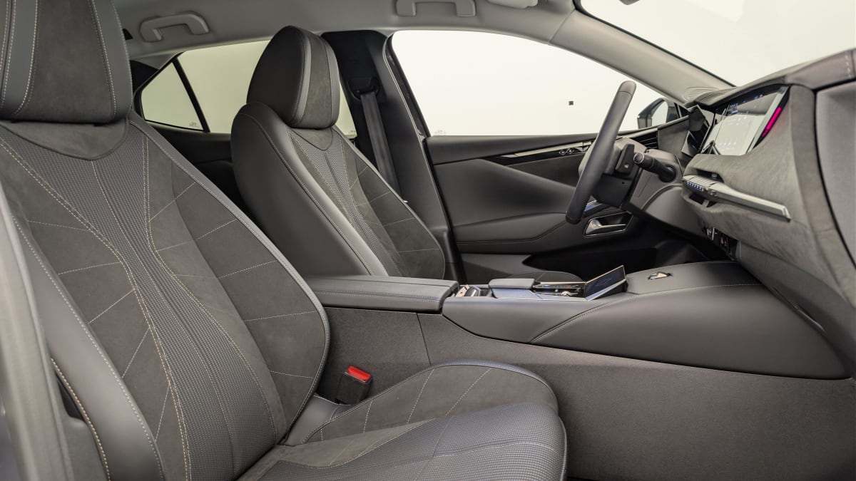 intérieur alcantara noir : planche de bord en alcantara ciel de pavillon clair sellerie en tissu tressé basalte avec alcantara et toile ds décors de panneaux de porte chrome guilloché volant cuir fleur mistral console en toile ds noir basalte panneaux de porte en alcantara et toile ds noir basalte